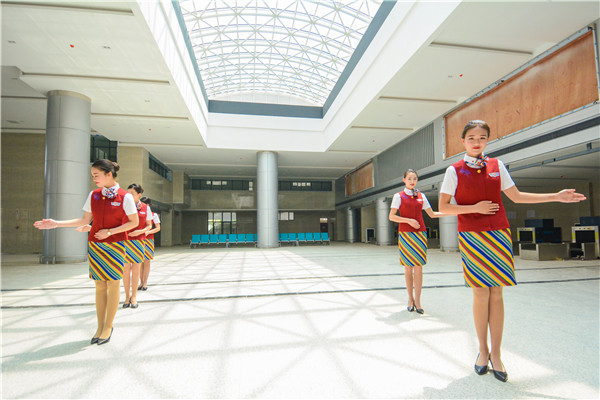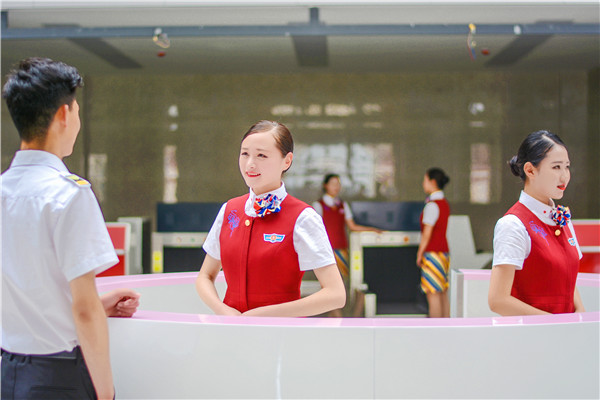 實(shí)訓(xùn)大樓一樓大廳按照標(biāo)準(zhǔn)候機(jī)樓布局打造,是成都雙流國(guó)際機(jī)場(chǎng)T2航站樓的縮小版,包含了售票、值機(jī)、安檢等實(shí)訓(xùn)環(huán)節(jié)。